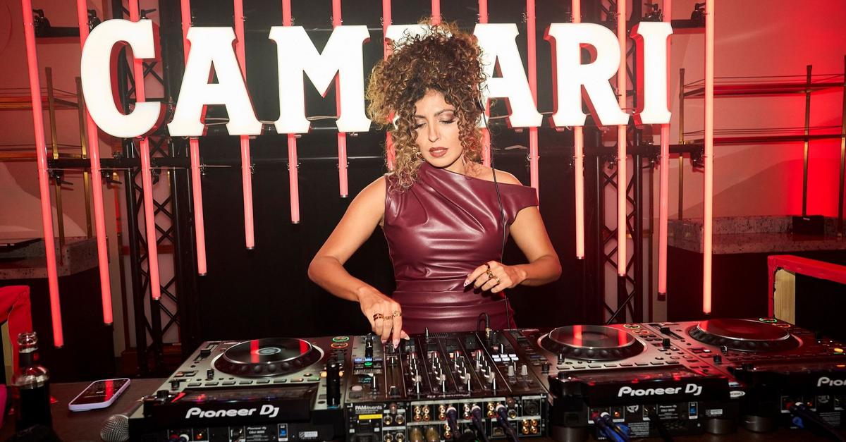 Eine Frau in dunkelrotem Kleid und hochgesteckten Haaren steht am DJ Pult. Hinter ihr Leuchtreklame.